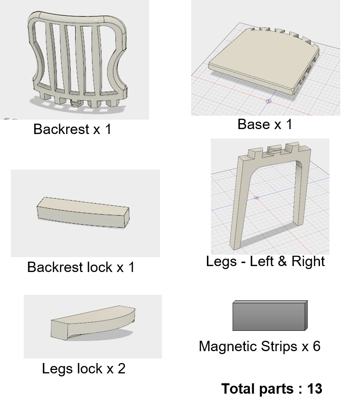 Digital Prototype: The digital prototype was created on Fusion 360. The assembly consists of only 7 parts and is intuitive. Magnetic lock pieces are provided to constrain all the degrees of freedom, particularly disassembly in the direction of assembly. Magnetic strip rolls are inexpensive and will be pre-assembled by gluing on to the mating parts. The user need not glue them on.